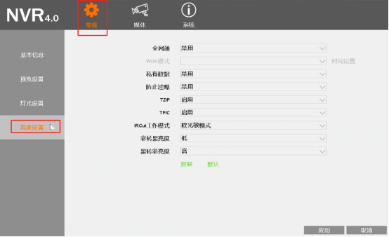 錄像機端操作:對著攝像頭的畫面右鍵IPC設置--高級設置里面有彩轉黑和黑轉彩的亮度高低設置,比如彩轉黑亮度選擇低代表暗一點的時候才切燈,選擇高代表環境較亮一點的時候就開燈。黑轉彩亮度選擇高代表早上亮一點的時候關燈,選擇低代表早上環境暗一點的時候就關燈