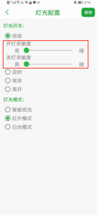手機端操作(僅支持插卡機):在攝像頭預覽界面點擊設置--燈光配置下有開燈靈敏度和關燈的靈敏度,開燈的靈敏度在亮代表環境亮度較亮的情況下開燈,關燈靈敏度在亮代表夜晚到早上環境亮的時候關燈